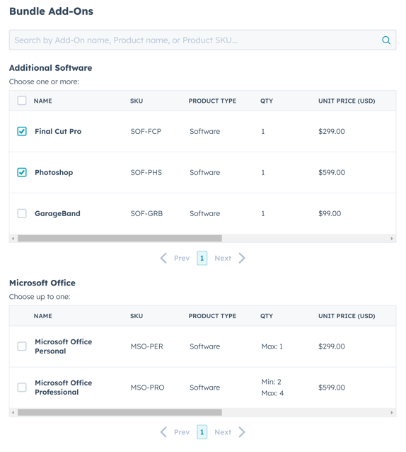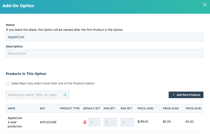 The Sales Rep may choose to include products from the Add-on Product Options. When they click "Select Products," they'll see the list of products across all Add-on options.