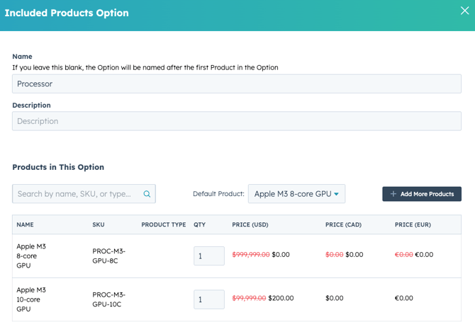 The default product for each Included Product Option will automatically be added to the quote at the price and quantity configured.