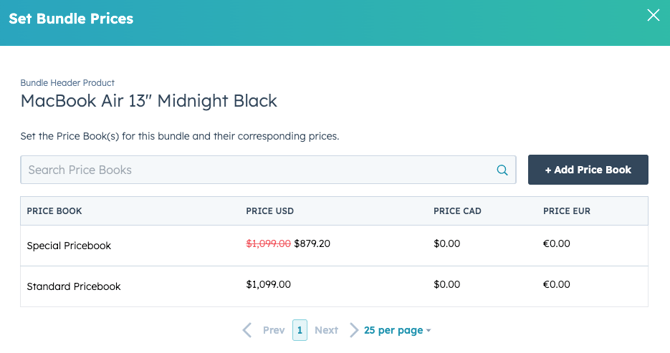 In this example, the MacBook Air bundle will be priced at $1,099 when sold from the Standard Price Book and $879.20 from the Special Price Book. Note that it's also possible to set prices for any supported currency.