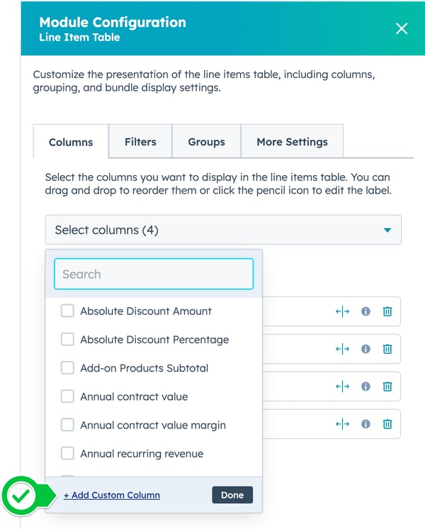 Custom columns let you add a fully customized, calculated, or conditional column to the line items table.