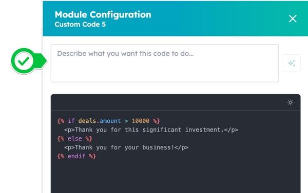 The Copilot, of course understands LiquidJS, but It also knows about the native and custom properties in your HubSpot portal. Just tell it what you want in plain English and play with the results.