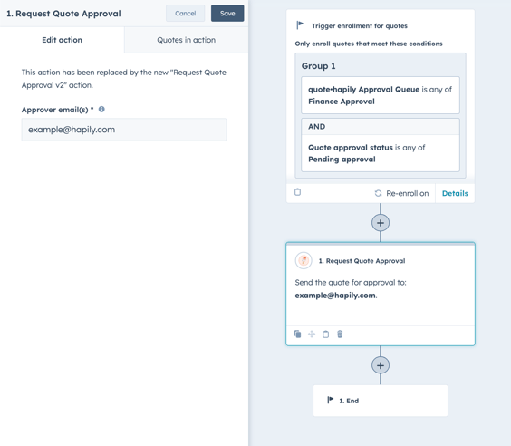 The Request Quote Approval action sends the designated approvers an email with a link to review the quote. When this workflow action is triggered, the quote will pause in this action (for up to one week) until it's been approved.