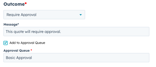 - Require Approval: In the "Outcome" dropdown, select "Require Approval" to ensure that any quote meeting the specified conditions will be flagged for review.