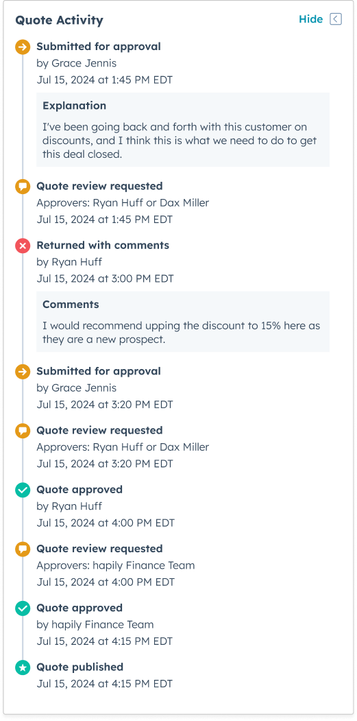 Quote Activity (left sidebar) — A collapsible timeline showing the full approval history of the quote. Click the collapse/expand button to toggle visibility.