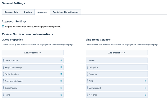 Tip: Approvers with Admin access can also reach these settings directly from the Review Quote screen by clicking the Customize link at the bottom of the Quote Properties or Line Items cards.