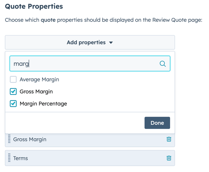 A property or column I added in Settings isn't showing on the Review Quote screen. Properties only appear if the quote has data for that field. If the value is empty, it will display as a dash (—) but will still be visible. Make sure the property name in Settings matches the HubSpot property name exactly.