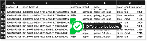 When you upload your variant spreadsheet, it can refer to different Price Books — you just need to include the correct Price Book ID in the sheet. You can copy the Price Book ID from any Price Book Details screen: